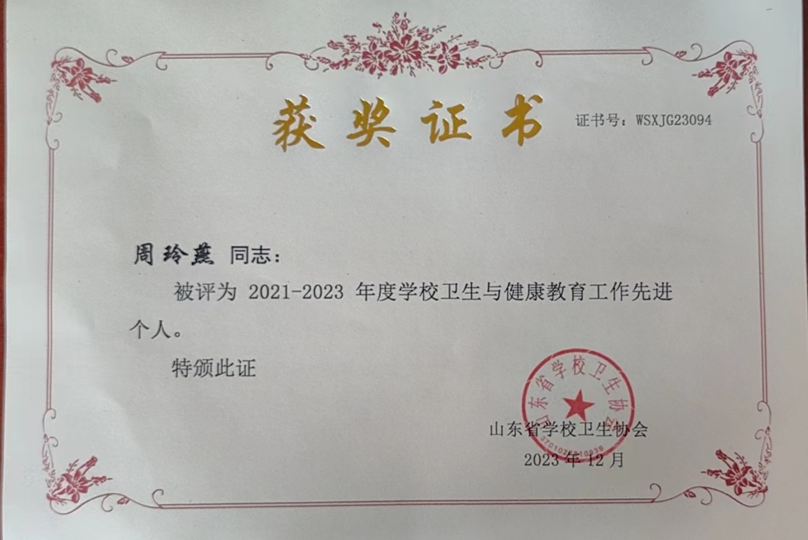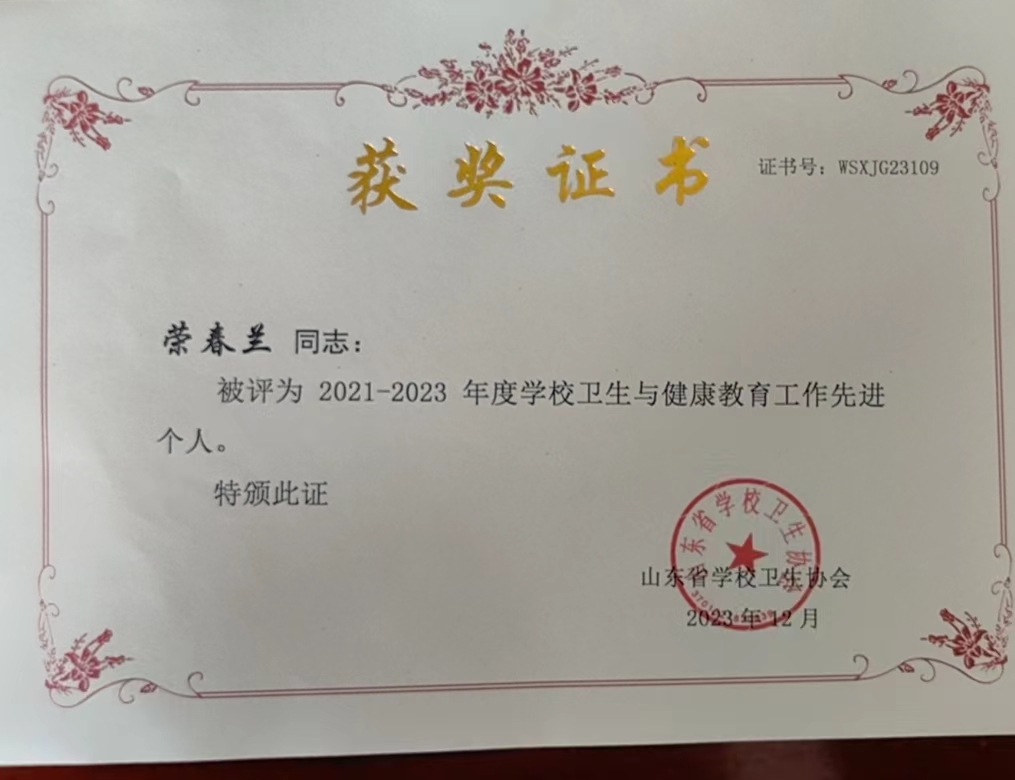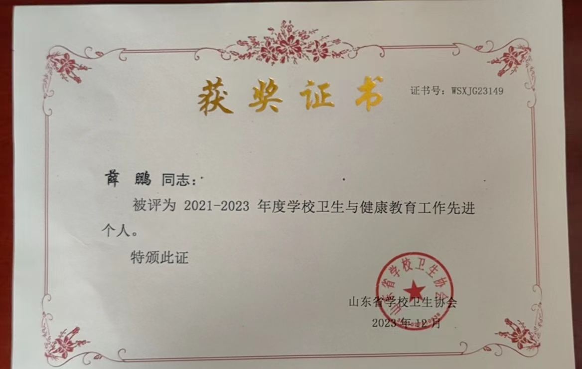 2023年12月15日,山东省学校卫生协会 2023 年学术年会在济南召开,此次会议由山东省学校卫生协会主办。会议表彰了全省各级各类学校卫生与健康教育先进集体和先进个人,我校获全省“学校卫生与健康教育先进集体”荣誉称号,校医院薛鹏、荣春兰和周玲燕3人获2021-2023年度“学校卫生与健康教育工作先进个人”荣誉称号。
